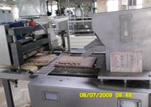 Чтобы получить вафельный лист, тесто готовят с высоким содержанием влаги - очень жидкое, сметанообразное. Для этого смешивают муку, меланж (вместо яиц), фосфатиды, растительное масло, соль, соду, воду. Яичные желтки и фосфатиды помогают отделять вафельные листы от форм, а также предохраняют их от ломки. Пористость теста достигается добавлением специальных разрыхлителей, а также его взбиванием. Готовое тесто сливают в бачок. С него автоматически с помощью насоса через разливочную трубу дозируется на поверхность формы. Тесто на поверхности формы прижимают другой плитой автоматически и выпекают. Процесс выпекания вафельных листов в следствии большой поверхности испарения и небольшой толщины изделия проходит от 2 до 3 мин при температуре поверхности плит 170-150°С. Влажность вафельных листов сразу после выпечки — 2-3%, а при хранении — не больше 4,5%. Формы печей должны быть прогрет до заполнения их тестом и периодически смазываться свиным жиром. Выпеченные листы охлаждают каждый отдельно на транспортере на протяжении 1-2 мин при температуре помещения (Рисунок 2.1). Поверхность вафель (гладкая, гравированная, фигурная) определяется поверхностью плит, в которых они выпекаются.