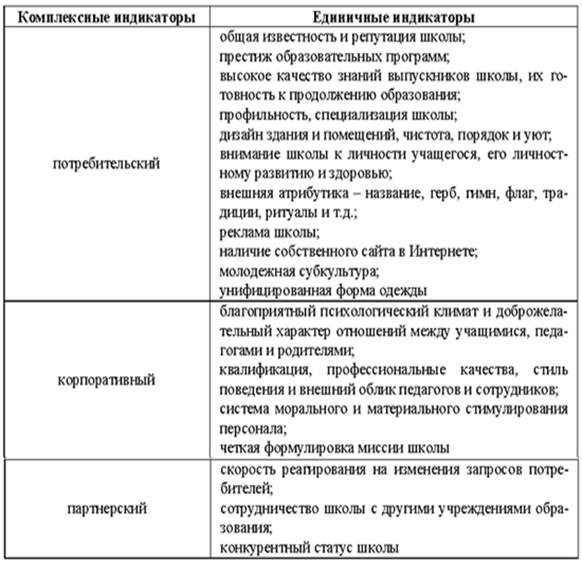 - качество образовательных услуг (вклад учебного заведения в развитие образовательной подготовки учащихся, их воспитанности, психических функций, творческих способностей, формирование здорового образа жизни; ясное видение целей образования и воспитания, сформулированное в миссии образовательного учреждения; связи школы с различными социальными институтами и т.д.);