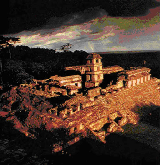 Паленке был первым городом классического периода, о котором стало известно в Европе. Его развалины среди густой тропической растительности были издавна знакомы местным индейцам, называвшим их На-Чан. Великий город пришел в запустение задолго до того, как на американский континент высадились первые европейцы. Впереди на вершине «акрополя» с крутыми склонами стоит большой дворец. Склоны эти местами обвалились и обнажили отверстия нескольких подземных ходов. У юго-западного угла «акрополя» на ступенчатой пирамиде возвышает ся здание с высоким сводчатым перекрытием. Это Храм Надписей, который так был назван потому, что в нем нашли плиту с длинной надписью из 620 иероглифов. Вокруг дворца кроме Храма Солнца и Храма Надписей имеются и другие— Храм Креста, Храм Льва, сложенные из белого камня. Дворец имеет не только башню, но и подземелье. Повсюду — на стенах, потолке, колоннах, в нишах и ступенях лестниц сохранились остатки великолепных барельефов и фресок.