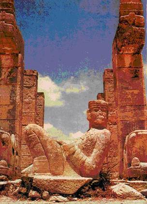 Недалеко от главной площади города находилось несколько каменных мужских фигур, лежащих на спине, с поднятыми над головой коленями, так называемых Чакмоолов — божеств, связанных с культом воды. На животе у них высечены чашевидные углубления для жертвенной крови. Археологами сделан вывод, что все эти «новшества» — неизгладимый след вторжения тольтекских племен, которые захватили город примерно в X в. В священной книге майя «Чи-лам-Балам» также даны подробные описания чужеземцев и столицы, которую они основали в Чичен-Ице. Сообщается, что «ицы» пришли сначала из далекого Толлана и что создателями этого города были тольтеки. Действительно, археологами было обнаружено много общего между культурой Чичен-Ица и городом Тулой в долине Мехико, который и является древним Толланом. В Туле были найдены фигуры воинов, которые украшали и Чичен-Ицу. А на стенах пирамид Тулы — фрески, до мельчайших деталей совпадающие с юкатанскими. Они изображали ягуаров, стервятников, пожирающих человеческие сердца. Были в Туле точные копии колонн Чи-чен-Ицы, у основания одной из пирамид — статуя полулежащего на спине Чакмоола. Оба города разделяло 800 миль труднопроходимых джунглей.
