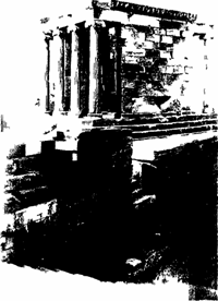 Первоначально раз в год, а позднее —раз в четыре года по священной дороге от Афин к Акрополю тянулось шествие с дарами богине Афине и с одеждой для нее — пеплосом, который ткали лучшие афинские девушки, начинались так называемые Пана-финейские празднества в честь богини — покровительницы города. Процессия проходила через парадный вход на холм — Пропилеи (архитектор Мнесикл, 437—432 гг. до н. э.), состоящий из ионической колоннады между двумя дорическими портиками,— на площадь Акрополя. Справа от Пропилеи на выступе скалы Акрополя, на высоком постаменте стоял храм Нике (арх. Калликрат; 449—421 гг. до н э.), ионического ордера, с деревянной скульптурой богини Нике Аптерос (бескрылой) внутри. Это редкое изображение бескрылой победы. В поэтическом воображении греков богиня победы рисовалась изменчивой, легко перелетающей от одного к другому, и поэтому чаще они изображали ее крылатой.