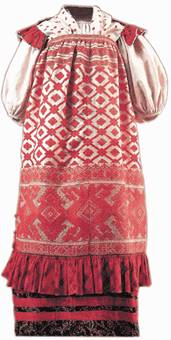 Но в старинном костюме рубаха редко носилась отдельно, чаще всего в северных и центральных районах России сверху надевался сарафан, а в южных - понева. Понева - это вид юбки, состоящей из трех полотнищ шерстяной или полушерстяной ткани, стянутых на талии плетеным узким пояском - гашником: ее носили только замужние женщины. Понева была круглая, то есть сшитая, или распашная, состоящая из отдельных полотен. В основном поневы были темно-синего, темно-красного, реже - черного цвета. Темное ее поле разделялось клетками, причем их цвет и размер зависели от традиций той губернии, села или деревни, в которых ткались поневы. Поневы, так же как и рубахи, делились на праздничные и повседневные. Будничные отделывались по низу узкой домотканой полоской тесьмы или полосками кумача. В праздничных же поневах большое внимание уделялось "клаже" - так называлась нашивка по подолу, в которой максимально использовалось все богатство отделки: многоцветная вышивка, позумент, мишурное кружево из золоченых и серебряных ниток, травчатые ленты, вьюнки, блестки, стеклярус и бисер. У круглых понев швы служили не только для соединения отдельных частей, но и как дополнительная отделка. Пояс - "покромка" ткался на станке из разноцветных шерстяных ниток, концы его распушивались и среди нитей вплетались нитки бисера.