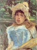 Юный художник блестяще решил задачу изображения человеческой фигуры в живой и изменчивой световоздушной среде. Свою, возможно, случайную модель - некрасивую молодую женщину в чуть нелепой шляпке, с веером в руке - он запечатлел на террасе, на фоне залитого солнцем общественного сада.