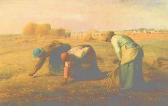 Основная тема его искусства - жизнь французской деревни. Наряду с некоторой идеализацией патриархальных сторон сельской жизни он создает произведения, проникнутые отчетливо выраженным пафосом социального протеста ("Человек с мотыгой", 1863), а от простого изображения деревенских сцен переходит к созданию обобщенных монументальных образов ("Собирательницы колосьев", 1857). Важную роль играет в картинах Милле пейзаж. Он мыслит его как место труда человека. Как справедливо заметил один критик, "в лесах Милле не отдыхают, а трудятся". [14]