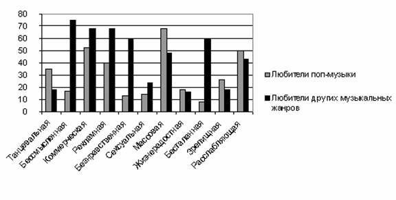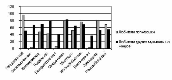 Как видно из диаграмм, в группе студентов-музыкантов первую позицию занимает такая характеристика поп-музыки, как «бессмысленная», (бессодержательная); вторую позицию поделили «рекламная», «коммерческая» и «массовая», третью – «безнравственная»; третью – «бесталанная». В группе студентов-немузыкантов первую позицию заняла такая характеристика, как «танцевальная», вторую позицию – «сексуальная», третью позицию между собой поделили «рекламная» и «зрелищная».