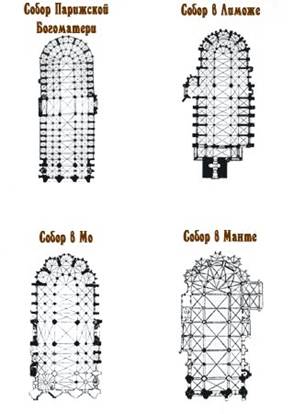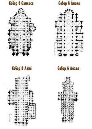 Готический стиль отличается от предшествовавшего; это стиль, создавший совершенно другую систему форм, организацию пространства и объёмную композицию. Эпоха готики совпала со временем становления и развития городских центров в период Классического Средневековья. Первые храмовые постройки готического стиля, ставшие образцом для более поздних сооружений, характеризуются уносящимися ввысь стройными колоннами, собранными как бы в пучки и раскрывающимися на каменном своде. В основе общего плана готического храма лежит форма латинского креста (Рис. 1). Снаружи и изнутри соборы украшались статуями, рельефами, витражами, живописью, подчёркивавшими наиболее характерную черту готики - устремлённость ввысь. Таковы были готические соборы в Париже, Шартре, Бурже, Бове, Амьене, Реймсе (Франция).