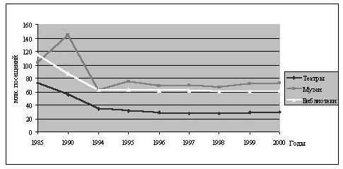 Уровень посещаемости музеев и театров за рубежом и в Россиина 1 января 1999 года