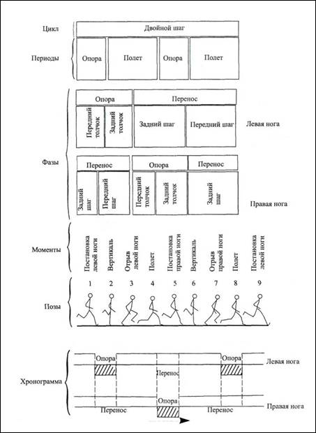 В двойном шаге содержатся два периода опоры и два периода полета. В каждом периоде различают две фазы. Период опоры включает в себя фазы торможения и отталкивания. А в периоде полета – фазы подъема и снижения ОЦМТ. Каждый период и каждая фаза имеют условные границы, которыми служат моменты движения.