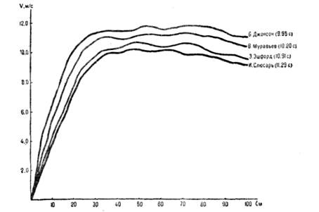 При беге по дистанции с относительно постоянной скоростью у каждого спортсмена устанавливаются характерные соотношения длины и частоты шагов, определяющие скорость бега. На участке дистанции 30-60 м спринтеры высокой квалификации, как правило, показывают наиболее высокую частоту шагов (4,7-5,5 ш/с), длина шагов при этом изменяется незначительно и составляет 1,25±0,04 относительно длины тела спортсмена (А. Левченко, 1986). На участке дистанции 60-80 м спринтеры обычно показывают наиболее высокую скорость, при этом на последних 30-40 м дистанции существенно изменяется соотношение компонентов скорости: средняя длина шагов составляет 1,35±0,03 относительно длины тела, а частота шагов уменьшается. Такое изменение структуры бега способствует достижению более высоких значений скорости бега и, главное, удержанию ее на второй половине дистанции.