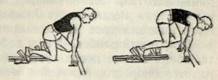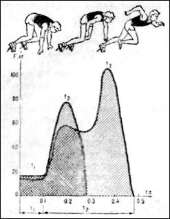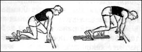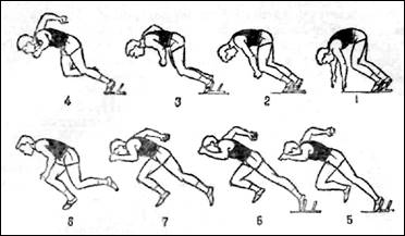 Услышав выстрел (или другой стартовый сигнал), бегун мгновенно устремляется вперед. Это движение начинается с энергичного отталкивания ногами и быстрого взмаха руками (сгибание их). Отталкивание от стартовых колодок выполняется одновременно двумя ногами значительным давлением на стартовые колодки. Но оно сразу же перерастает в разновременную работу. Нога, стоящая сзади, лишь слегка разгибается и быстро выносится бедром вперед; вместе с этим нога, находящаяся впереди, резко выпрямляется во всех суставах (рис. 4.).