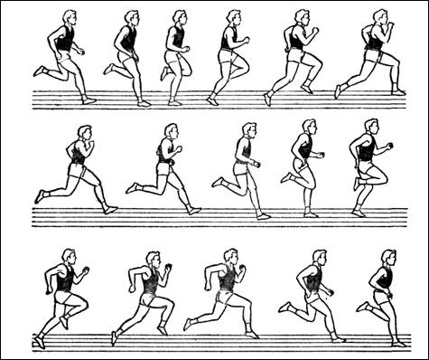 Бег по дистанции. К моменту достижения высшей скорости туловище бегуна незначительно (72-80°) наклонено вперед. В течение бегового шага происходит изменение величины наклона. Во время отталкивания наклон туловища уменьшается, а в полетной фазе он увеличивается.