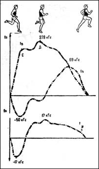 Запись динамограмм опорных реакций представлена на рис. 10. Кривая вертикальных усилий может иметь различную конфигурацию – однопиковую, двухпиковую (В. К. Бальсевич, 1965; Н. А. Фесенко, 1972 и др.). Ее величина и продолжительность зависят от: скорости бега, массы тела спортсмена, степени согласованности движений отдельных звеньев тела, напряжения мышц опорной ноги, расстояния между проекцией ОЦМТ и стопой ноги в момент постановки ее на опору.