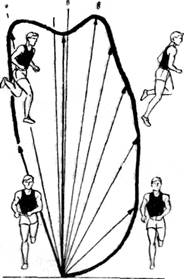 Большое значение имеют энергичные движения рук вперед-назад. В стартовом разбеге они в основном такие же, как и в беге по дистанции, но с большой амплитудой в связи с широким размахом бедер в первых шагах со старта. На первых шагах со старта стопы ставятся несколько шире, чем в беге по дистанции. С увеличением скорости ноги ставятся все ближе к средней линии. По существу бег со старта – это бег по двум линиям, сходящимся в одну к 12-15-му метру дистанции.