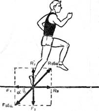 Когда тело бегуна находится прямо над центром давления на площадь опоры, то реакция опоры под действием массы тела бегуна направлена вертикально вверх (вертикальная составляющая реакция опоры). Но ОЦМТ не всегда находится над центром давления на опору. В этом случае опорная реакция будет направлена под острым углом. Поэтому силу давления ( F ) и силу реакции опоры ( R ) можно разложить на две составляющие: вертикальную ( Fy , Ry ) и горизонтальную ( Fx , Rx ). Равнодействующая этих величин и будет определять движение бегуна. Вертикальная составляющая реакции опоры противодействует силе тяжести. В том случае, когда Fy больше веса тела бегуна, движение ОЦМТ направлено вверх, и наоборот. Горизонтальная составляющая реакции опоры зависит от общей силы давления на грунт ( Fo 6щ ) и от угла α, под которым производится давление, и играет первостепенное значение в поступательном движении. Угол α называют углом отталкивания. Угол отталкивания определяется по углу наклона продольной оси ноги в момент отталкивания от дорожки. Продольная ось соединяет точку давления ноги на опору и тазобедренный сустав. Кроме того, в биомеханике спорта угол отталкивания определяют по направлению опорной реакции, по направлению линии, соединяющей точку опоры с ОЦМТ, по направлению ускорения ОЦМТ Он определяет направление равнодействующей Fx и Fy (рис. 9.). В спринтерском беге величина Fo 6щ , намного больше, чем в беге на средние и длинные дистанции, и направлена под более острым углом.