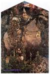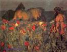 Но земля, кони, одинокая фигура будто напоены жаром ушедшего дня. Багровые цветы чертополоха, рыжий конь - все будто несет следы ушедшего солнца. Отчизна пращуров.