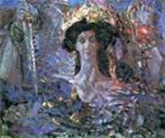 В некоторой близости к этой картине - "Гадалка" (1895, ГТГ), произведение глубоко психологическое. Среди лилово-розового мерцания ковра и шелковых тканей Врубель мастерски выделяет лицо. Властно влечет пристальный взгляд горящих глаз, словно перед женщиной раскрылась страшная тайна будущего. Она, прекрасная и загадочная, раскладывает карты, угадывая чью-то судьбу. Но важен не рассказ, а ощущение тайны, переданное не только инфернальной внешностью героини, но и движением имматериальных и светоносных пятен цвета.
