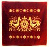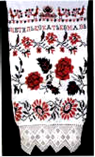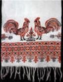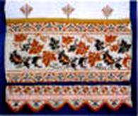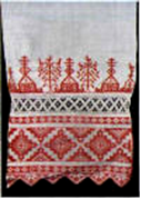 Композиции с человеческими фигурами и птицами особенно типичны для вышивок из района Чарозера и Устюжны. Они украшали главным образом полотенца, на длинных узорных концах которых нередко вышивка сочеталась с ткаными проставками, полосами кумача, плетеным и вязаным кружевом. В вышивках этих местностей часто встречаются изображения птицы-павы с длинным хвостом и особенно женской фигуры. Расположенная в центре трехчастной сцены или повторяясь в ряду, в одних произведениях она схематична и геометризована, вместо головы - цветок-розетка, а поднятые крючья-руки оканчиваются гребнями-пальцами; в других случаях изображение более конкретно, руки на поясе, а голова подобна человеческой. Иногда такие фигуры держат в руках птиц. Если устюженская вышивка исполнялась целиком крупными стежками двустороннего шва, то в чарозерских в дополнение к нему применялась еще техника "набора" с характерными вертикалями прямых линий.