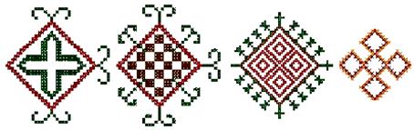 Наиболее распространенным мотивом в орнаменте народной вышивки является "ромб". В вышивке разных народов он выглядит по-разному и имеет различные значения. Ромб с крючками в вышивке рассматривается как символ плодородия, связанный с представлением о матери - прародительнице - непосредственном начале всех рождений на земле. Ромб - "репей" в фольклоре сравнивается с дубом, священным деревом многих народов, и является метафорой небесного "цвета" - молнии, которая разит демонов, оберегает скот. В числе любимых мотивов была "розетка", состоящая из 8 - ми лепестков - лопастей, соединенных в центре Она выступает как символ женского начала, плодородия. Среди мотивов растительного орнамента видное место занимает "мировое дерево" - дерево жизни.