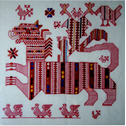 На подзоре XIX века из Сольвычегодского уезда вышиты барсы с поднятыми лапами и процветшим хвостом, чередующиеся с пышными кустами. Образ барса и торжественный строй композиции напоминают об их истоках в средневековом искусстве. Но мастерицы исполнили узор в традициях крестьянской вышивки своего района, для которой характерен шов в мелкий крестик с зернистой рельефной фактурой поверхности.