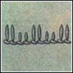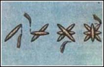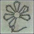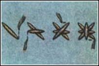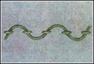 Стебельчатый шов (Рис.6). Использовался для вышивания контурных узоров, стебельков и веточек, обшивали мотивы узора в вышивке, которая называется "орловский спис". При выполнении кривой линии (выгнутой или вогнутой) игла выкалывалась со стороны центра круга, если рассматривать кривую линию как часть окружности. Шов образует сплошной ряд косых стежков, плотно прилегающих друг к другу. Он мог выполняться в направлении слева направо, если вышивался двумя руками и в направлении от себя, если вышивался правой рукой, а левой держали пяльцы. Сделав на ткани первый стежок от себя, игла с ниткой выводилась на середину левой стороны стежка, укладывалась к себе и прижималась к ткани большим пальцем левой руки. Выполняя второй стежок, делается прокол в ткани выше первого стежка, а выводится игла в середине второго стежка с левой стороны. Шов выполняется движением иглы к себе, укладывая стежки от себя. Каждый новый стежок при этом выходится вперед наполовину предыдущего. При выполнении стебельчатого шва рабочая нитка должна была быть всегда с одной стороны - справа или слева. Менять направление нитки во время работы было нельзя, так как при этом нарушалась структура шва. Все стежки должны быть одной величины.