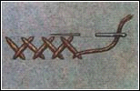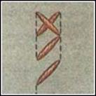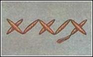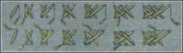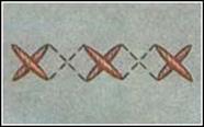 Шов "козлик" (рис.8). Этим швом вышивали мелкие листочки, сердцевины цветов и т.п. Использовался он и для вышивки всего узора с произвольным контуром. Ровные полоски шва использовались, как дополнение к большим, сложным вышивкам, а также для маскировки швов при соединении кусков ткани. Стежки располагались слева направо, делая проколы в ткани попеременно по одному и другому краю полосы. Расстояние между проколами одинаковое. В середине полосы стежки перекрещиваются. Каждый новый стежок ложился поверх предыдущего.