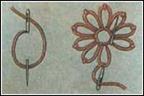 При выполнении шва по кривой линии (окружность в сердцевинах цветов, листья и др.) расстояние между проколами по краю большей окружности длиннее расстояния между проколами, расположенными по краю меньшей окружности.