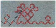 Тамбурный шов (рис.10 а) представляет собой непрерывный ряд петель, выходящих одна из другой. Шов мог выполняться как в пяльцах, так и без них. В обоих случаях стежки выполнялись движением иглы к себе. Вышивая без пялец, нужно было внимательно следить за тем, чтобы ткань не стягивалась, а петельки шва имели округлую форму. Если вышивали ниткой, сложенной вдвое, то закрепление нитки на ткани могло быть первой петлей тамбурного шва. После закрепления рабочую нитку укладывали петлей в направлении слева вниз направо, а игла вводилась в ткань в середине первой петли, в точку, из которой вышла нитка на лицевую сторону ткани. Игла выкалывалась на 4-5 нитей ткани ниже первой петли так, чтобы петля из рабочей нитки была под иглой. Так вышивались по прямой линии, отсчитывая одинаковое число нитей ткани для каждого стежка.