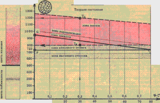Размеры зерна, а, следовательно, и прочностные свойства металла в значительной степени определяются температурным режимом ковки. Поэтому ковать металл следует в определенном интервале температур, чтобы измельченные в процессе деформирования зерна затем снова не выросли под действием высокой остаточной температуры. Каждый кузнец, чтобы получить из стали качественное изделие и придать ему соответствующие свойства с помощью термообработки, должен разобраться в диаграмме состояния железо—углерод (Приложение №1, Диагр.1).