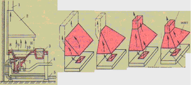 Как правило, зонты укрепляют над горном на высоте 500—600 мм от стола (Приложение №4, рис.2). Однако не всегда такая высота расположения зонта способствует максимальному удалению отходящих газов. Поэтому для лучшего улавливания дыма высоту зонта приходится определять опытным путем, учитывая особенности горна, например силу дутья. В некоторых случаях зонты оснащаются опускающимися крыльями. Недостаток металлических зонтов — быстрое их прогорание.
