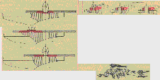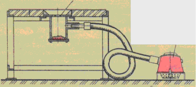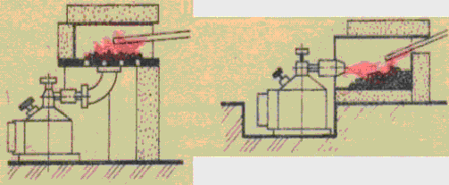 Переносные горны применяются для нагрева заготовок небольшого размера. Переносной горн состоит из металлической рамы, на которой сверху крепится стол с очагом и вентилятором для подачи воздуха. Вентилятор приводится во вращение от ножной педали. Можно для нагрева заготовок использовать паяльную лампу, которую ставят в небольшую ямку, а рядом складывают печурку из огнеупорного кирпича (Приложение №5, рис.4). Заготовки закладывают в щель между кирпичами. Или же кирпичи ставят на торец, на них кладут колосниковую решетку, а на нес устанавливают печурку из четырех кирпичей, в которую засыпают уголь. Снизу размещается паяльная лампа с патрубком. Конструкция легкого переносного горна с бытовым пылесосом показана на (Приложение №6, рис.5). Постамент горна сварен из уголков, а верхняя часть стола выложена из огнеупорного кирпича. На верхние горизонтальные уголки кладется фурма с зольником. На расстоянии 150 мм от фурмы к зольнику приваривают патрубок внутренним диаметром 30 мм, который соединяют с шлангом пылесоса. При этом необходимо иметь в виду, что шланг вставляется в этом случае не в нижнее, а в верхнее (нагнетающее) гнездо пылесоса. Нижнюю чашку пылесоса с фильтром снимают, а пылесос устанавливают на подставку. В тех случаях когда отсутствует электричество для привода вентилятора, можно использовать Клинчатые мехи двойного действия дают спокойное дутье, в результате чего создается ровное пламя и заготовки нагреваются равномерно (Приложение №6, рис.6).