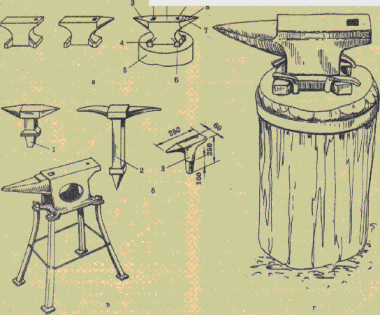 Легкие переносные (походные) наковальни имеют специальные ножки. Наковальни продаются в хозяйственных магазинах. Если наковальню купить не удалось, то на первое время ее можно заменить куском рельс или массивным прямоугольным металлическим бруском.