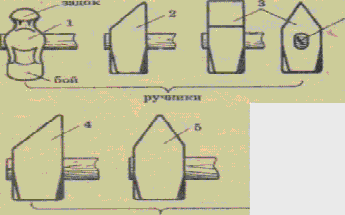 К ударному инструменту относят молотки-ручники, боевые молоты и кувалды (Приложение №8, рис.8). Ручник — основной инструмент кузнеца, с помощью которого он кует небольшие изделия или управляет процессом ковки с молотобойцами.
