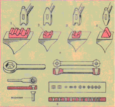 а — обжимки (1—3) и подбойка (4); б — приспособления для высадки гвоздей, болтов, заклепок