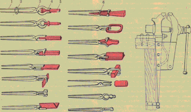 (а) и стуловые тиски (б): 1 — рукоятка; 2— зажимное кольцо; 3— заклепки; 4— губки; 5 — заготовка; 6—петля.