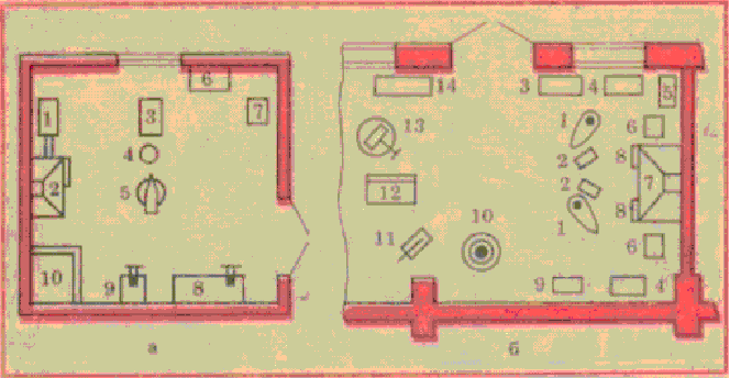 а — кузница на одну наковальню (1 — вентилятор; 2 — горн; 3 — стол для инструмента; 4 — бачок с водой; 5—наковальня; 6 — шкаф для инструмента; 7 — точило; 8— верстак; 9 — кузнечные тиски; 10 — ящик для угля); б — кузница на две наковальни (1 — наковальня; 2— стол для инструмента; 3—4— рабочие столы; 5 — шкаф; 6 — бочка с водой; 7 — горн; 8— вешалки для клещей; 9— точило; 10 — пневматический молот; 11 — ручные ножницы; 12— правильная плита; 13 — стуловые тиски; 14 — стеллаж для заготовок