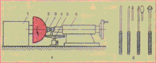 1 — токарный станок; 2 — выдавленная заготовка на оправке: 3 — прижим; 4 — опорный штифт; 5 — упор; 6 — задняя бабка