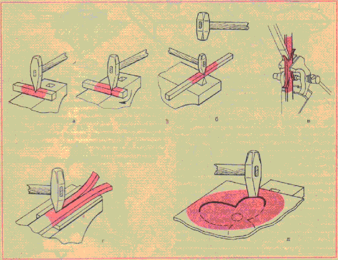 — отрубка при помощи зубила; б — отрубка при помощи зубила и подсечки; в — разрубка отщепов в тисках; г — продольная разрубка; д — вырубка (просечка)