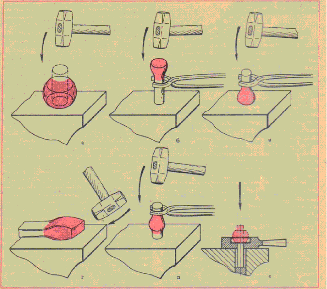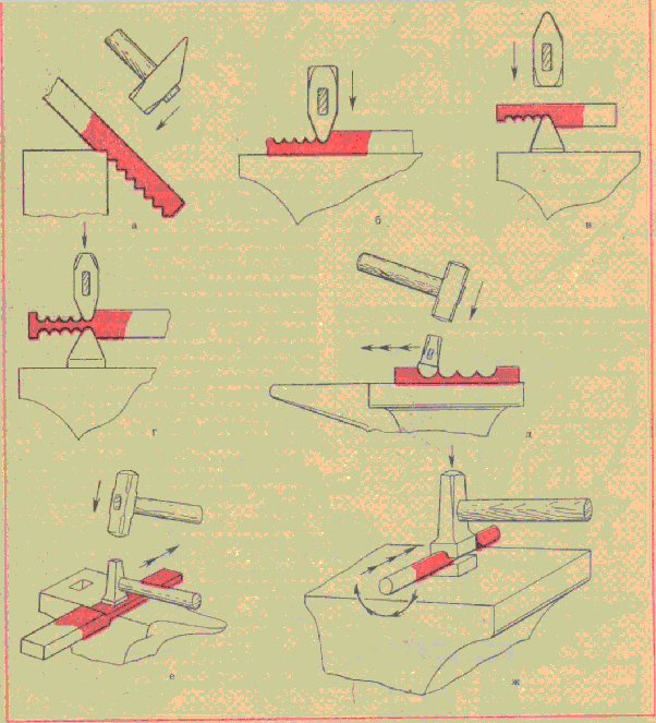 а — на ребре наковальни; 6 — при помощи задка кувалды; в — на подбойке; г — на парной подбойке; д — с верхней подбойкой; е — при помощи гладилки; ж — в оправках
