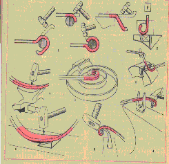 Для улучшения качества изготовляемых изделий и повышения производительности кузнецы часто применяют различный подкладной инструмент, устанавливаемый под молот или на наковальню. Для работы под молот используются простые и фасонные кузнечные зубила, пробойники, гладилки и раскатки (Приложение №9, рис.10).На наковальню устанавливаются подсечки, конусные оправки, вилки для гибки, гвоздильни, различные скобы и приспособления для специальных видов ковки кузнецы часто применяют различный подкладной инструмент, устанавливаемый под молот или на наковальню. Для работы под молот используются простые и фасонные кузнечные зубила, пробойники, гладилки и раскатки (рис. 11). На наковальню устанавливаются подсечки, конусные оправки, вилки для гибки, гвоздильни, различные скобы и приспособления для специальных видов ковки