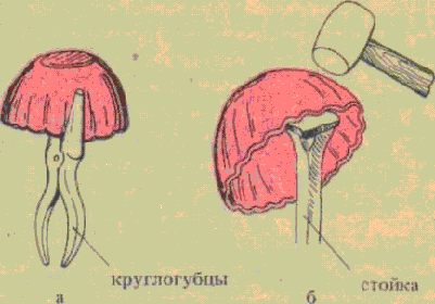 Применяется ипарный подкладной инструмент, к которому относятся о б - жимки, подбойники, гвоздильни с шляпочными молотками, специальные штампы для фигурных изделий.
