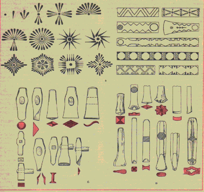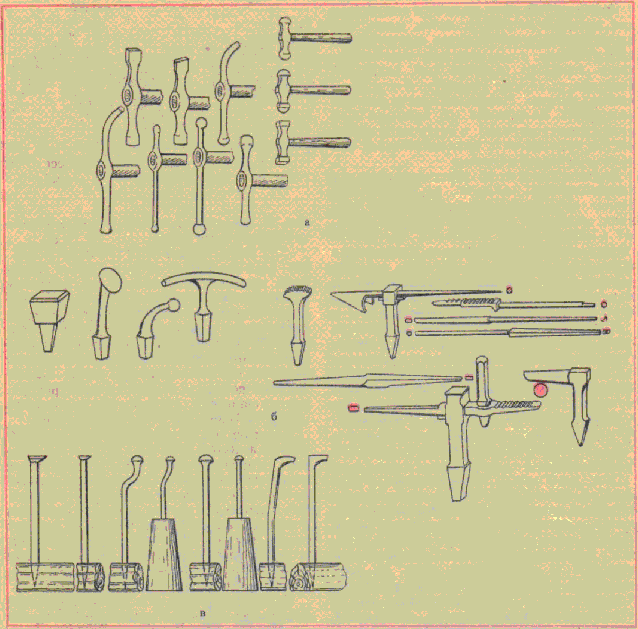 Молотки для дифовки(а); подкладной инструмент (б); вертикальные «стойны» (в)