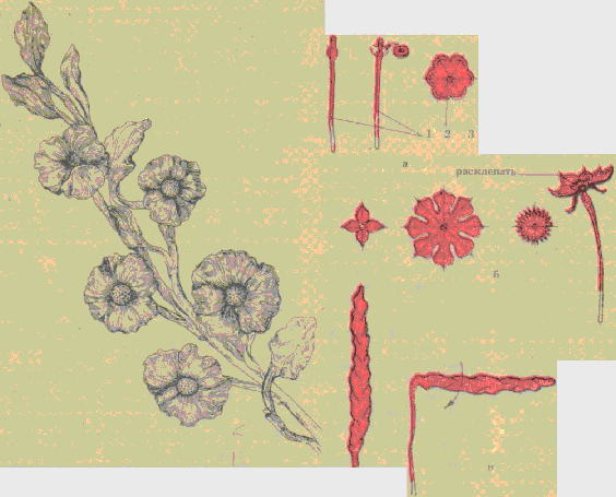 а— нарцисс (1—стержень с утолщением на конце; 2— розетка; 3 — цветок в
