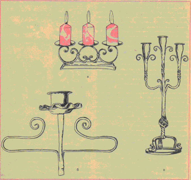 Наибольшую выдумку и творческую изобретательность проявляли мастера при ковке светцов — первых осветительных приборов. Если вначале их делали упрощенными, в виде небольших веточек с завитками, то с конца XVIII в. появляются цельнокованые светцы, которые выглядели уже значительно изящнее своих предшественников. Основное внимание уделяли кузнецы навершию светца, то есть верхней его части, куда вставлялись лучины. Навершие состояло из причудливых завитков, расщепов, шишечек и других украшающих элементов. В полумраке крестьянской избы светец с горящими лучинами походил на заморский цветок из волшебной сказки.
