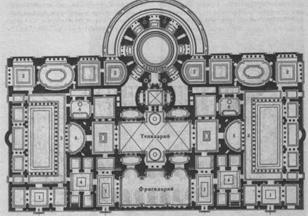 Для удовлетворения культурных и духовных потребностей капризного и избалованного жителя имперского благоустроенного города были сооружены цирки, где происходили состязания колесниц и конные заезды (самый крупный в Риме - Большой цирк - имел общую длину 600 м, ширину 150 м и вмещал 60 тыс. зрителей); амфитеатры, где проходили гладиаторские бои и травля зверей (самый знаменитый - амфитеатр Флавиев Колизей, построенный в 75-80 гг., рассчитан на 50 тыс. зрителей, размеры осей 188 X 156 м); театры (например, город Помпеи при населении около 15-20 тыс. человек имел два каменных театра на 1500 и на 500 зрителей). Из других видов общественных зданий римляне разработали специальные хранилища для библиотек, архивов, особое здание для деловых встреч и судебных заседаний (базилика). Оригинальным, чисто римским архитектурным сооружением стали знаменитые термы - сложный архитектурный комплекс, включающий серию банных помещений: раздевалки, помещения с холодной, теплой и горячей водой, бассейны, портики, беседки, библиотеки, которые могли окружаться садом для прогулок. Знаменитые термы Нерона, Траяна, Каракаллы занимали несколько гектаров площади (термы Каракаллы, например, 12 га) и могли обслуживать одновременно 1,6 тыс. посетителей.