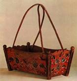 Архангельская область, Красноборский район, деревня Большой двор на Цивозере. Кистевая роспись. 76x41 х28. Привезена экспедицией Загорского музея (1959, О. В. Круглова). Все внешние стенки люльки расписаны. Люлька находилась в старинном доме, интерьер которого был украшен такой же росписью. Она, по-видимому, была расписана одновременно с интерьером и занимала центральное место в избе.