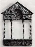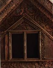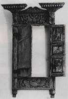 Горьковская область. Глухая резьба. 180 х 125. В наличнике светелки четко читаются все основные элементы классического портика. Окно светелки занимало центральную часть фронтона. Нижняя доска украшена трехчастной композицией с двумя львами и берегиней в центре. Четыре витые колонки поддерживают раскрепованный антаблемент с круглой аркой. Западающая его часть и два боковых выступа украшены изображениями птиц. Исходя из предложенной М. П. Званцевым классификации, этот наличник происходит из северных или северо-западных районов Поволжья и датируется 1880-ми годами, когда сказочные существа стали занимать основное место в декоре.