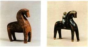 Конек. Игрушка. Начало 20 века. Архангельская область, Лешуконский. район, село Палащелье на реке Мезень. Резьба. 16 х 6 х 19,5. Привезен экспедицией Загорского музея (1961, О. В. Круглова). Очень скупыми средствами создает резчик образ сильного, могучего коня, несмотря на маленький размер игрушки. Небольшая головка, крутая шея, широкая грудь и широко расставленные прямые ножки подчеркивают впечатление монументальности скульптуры. Сбруя передана резьбой. Конек. Игрушка. Начало 20 века. Архангельская область, Лешуконский. район, село Палащелье на реке Мезень. Резьба, окраска. 22x5,5x23,5. Привезен экспедицией Загорского музея (1961, О. В. Круглова). Конек вырезан вместе со всадником из одного куска дерева. Видимо, он стоял на подставке с колесиками. Сбруя сделана из пистонов, вбитых в дерево. В решении образа много общего со стилизованными коньками в росписи мезенских прялок.