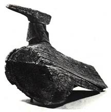 Архангельская область, Красноборский район, деревня Парфеновская на реке Северная Двина. Рублен топором. 73 х 39 х 51. Привезен экспедицией Загорского музея (1959, О. В. Круглова). Этот охлупень-утица украшал дом, фасад которого выходил на берег Северной Двины и был виден с реки. Очень четкий и выразительный силуэт скульптуры являлся прекрасным завершением постройки. При обработке корневища мастер превосходно использовал естественную форму пня: один из отростков корня он предназначил для шеи утицы и, завершив его головкой с длинным клювом, тоже решенной очень обобщенно, он достиг предельной характерности силуэта. Подобной формы охлупни встречаются на Севере крайне редко.