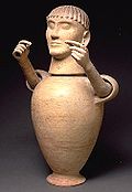 Самыми знаменитыми подобными произведениями являются терракотовые этрусские саркофаги; но им предшествовали бронзовые и глиняные урны, а с VIIв. до н.э. канопы, (См. Приложение, рис.1) чьи навершися выполнялись в форме человеческой головы (например, канопы из Кьюзи, Четоны, Солайи), а ручки выполнялись в форме человеческих рук. Уже в VIII—VII веках до н.э. крышки урн украшались масками, которые схематично и примитивно передавали человеческое лицо. Волосы передаются прямыми линиями, прочерченными в глине, черты лица крупные и грубоватые, большой нос и плотно сжатый рот с узкими губами.