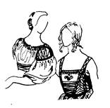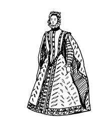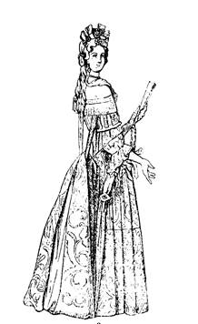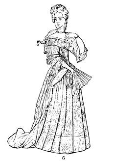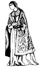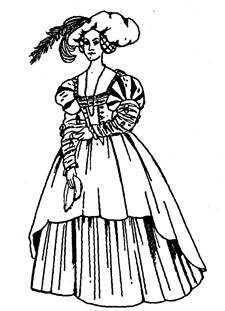 • Второе — верхнее платье — было с узким глухим лифом, спереди с вырезанным мысом, с нагрудной вставкой, на каркасе, с длинными широкими откидными рукавами с разрезами, а под ними были съемные рукава. Эти съемные рукава соединялись с проймами посредством шнуровки, которая прикрывалась фестонами или валиками.